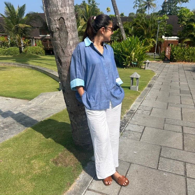 Elevate your everyday rotation with the Ana Shirt, a masterclass in detail and design from Poppy & Co. While it boasts the cool, indigo aesthetic of a classic denim button-down, it is expertly crafted from lightweight cotton, ensuring you stay comfortable from your morning coffee to late-afternoon meetings.