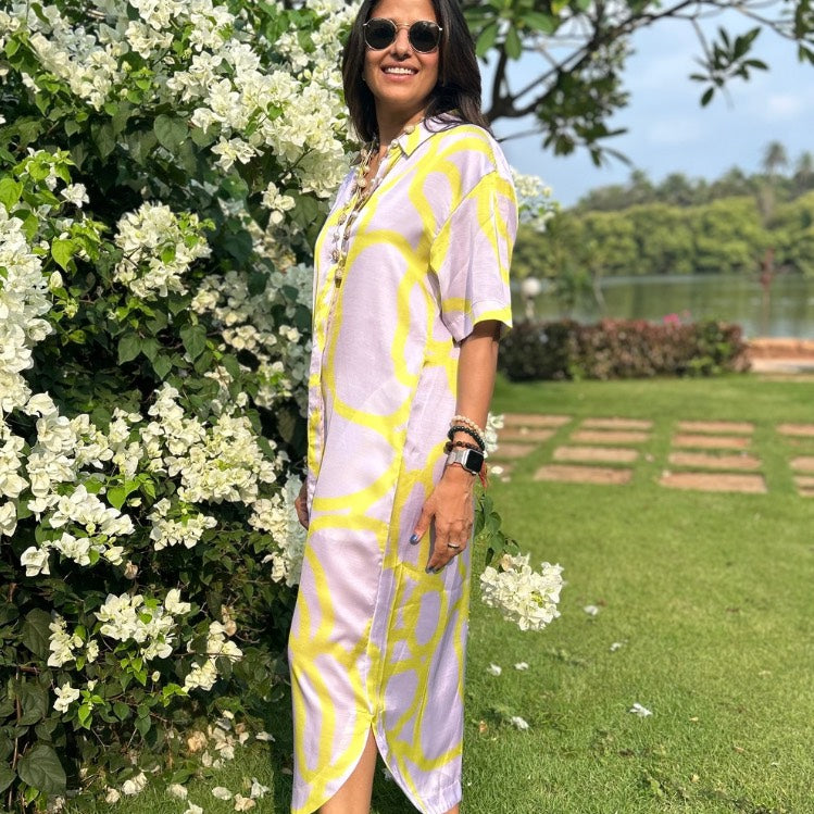Lavender & Lime Green Shift Dress is our premium, breathable shirt dresses are made from plant based fabric. Fabric used is ethical and made from the pulp of beech trees, that uses less water to grow.