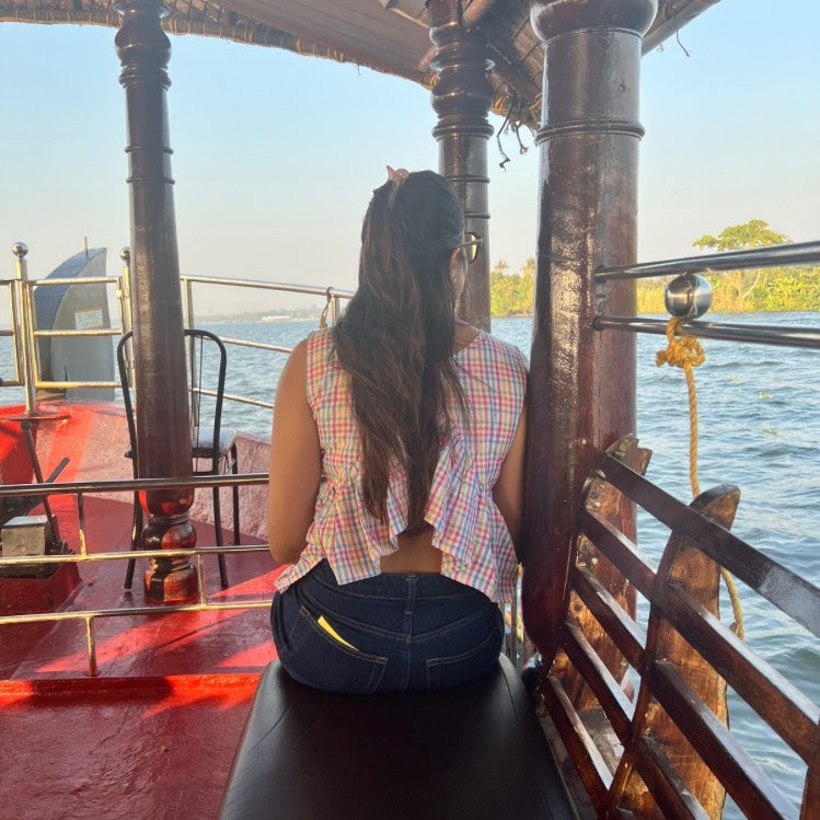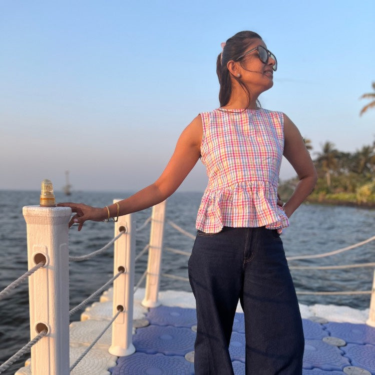 Crafted from a lightweight fabric meant for 90% humidity, it’s the perfect breezy companion for navigating the installations at Fort Kochi or catching the sunset over the Arabian Sea. Just pair it with wide-leg jeans or linen trousers and let the ruffles do the talking.
