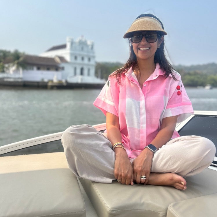 Crafted from a lightweight, breathable fabric, the Brookie features a relaxed, oversized silhouette that flows beautifully—whether you’re lounging on a boat or strolling through a seaside market. The standout detail? Playful cherry print on the shirt, adding a whimsical pop of color and personality.